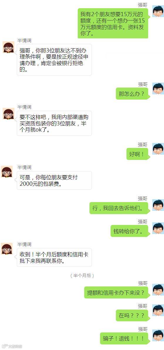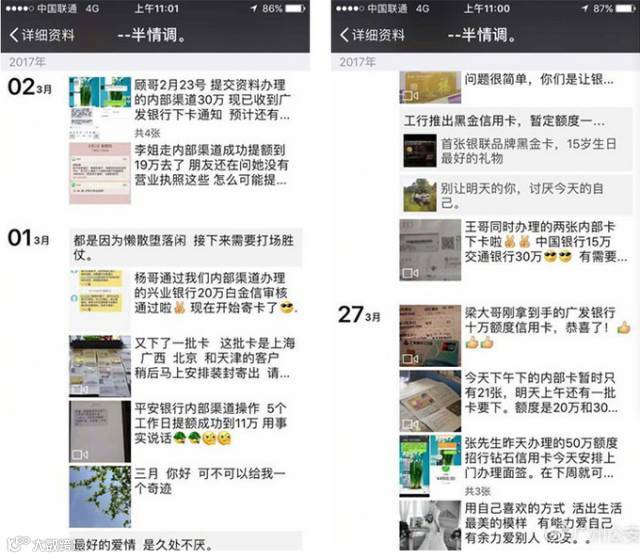 增城市民阿强(化名)有一位微信女好友叫“半情调”,她自称是银联的工作人员,专门网上代办信用卡,且有内部渠道让有资金需要的朋友办理到高额度信用卡或提高信用卡额度;她在微信朋友圈也经常晒出一些成功代办高额度信用卡或者信用卡成功提额的案例截图。