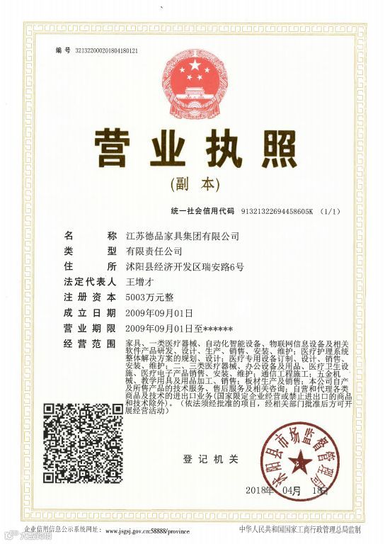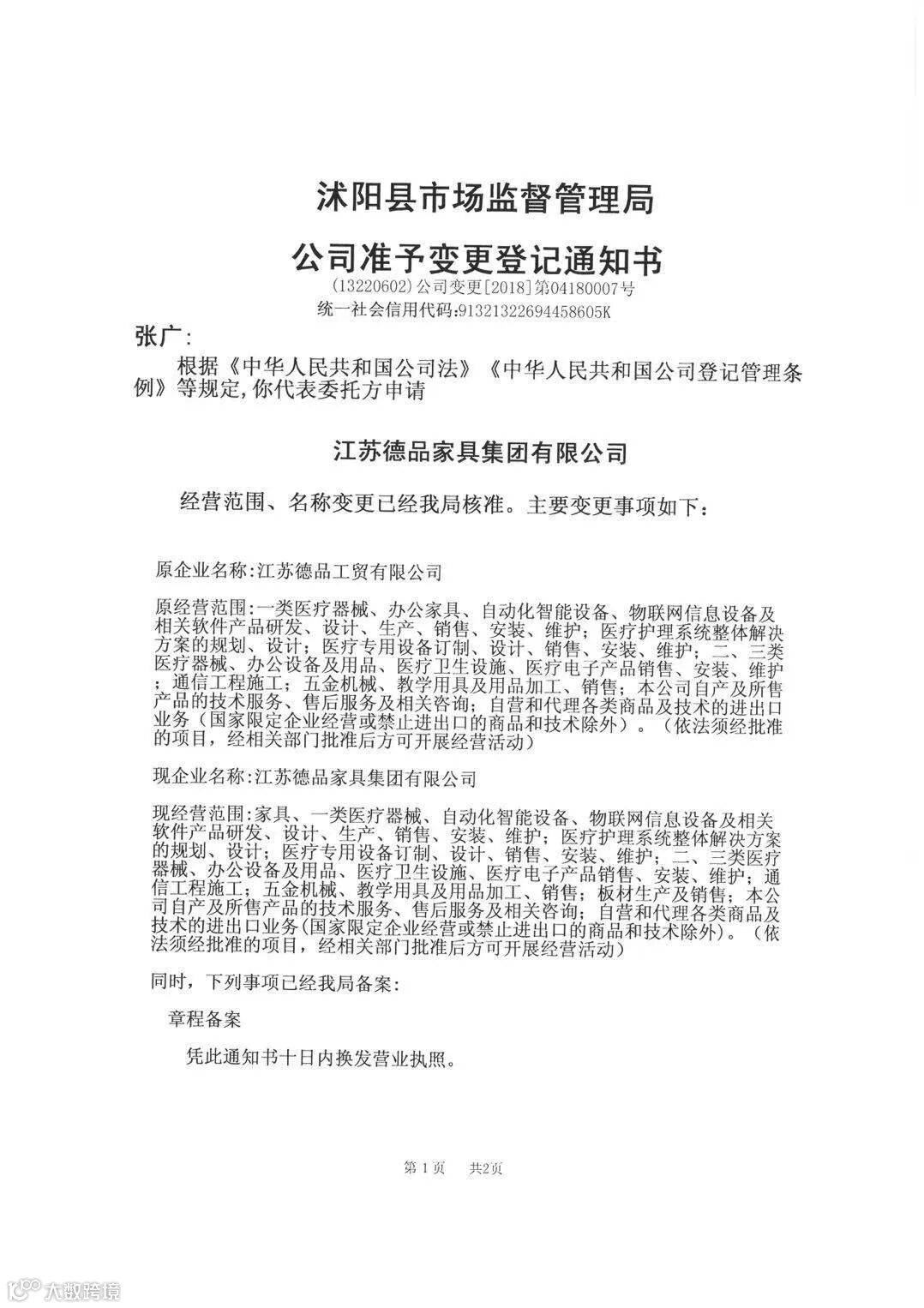 原江苏德品工贸有限公司已于2018年4月18日正式变更名称为江苏德品家具集团有限公司,感谢一路有您的支持!江苏德品家具集团精彩继续,敬请期待!