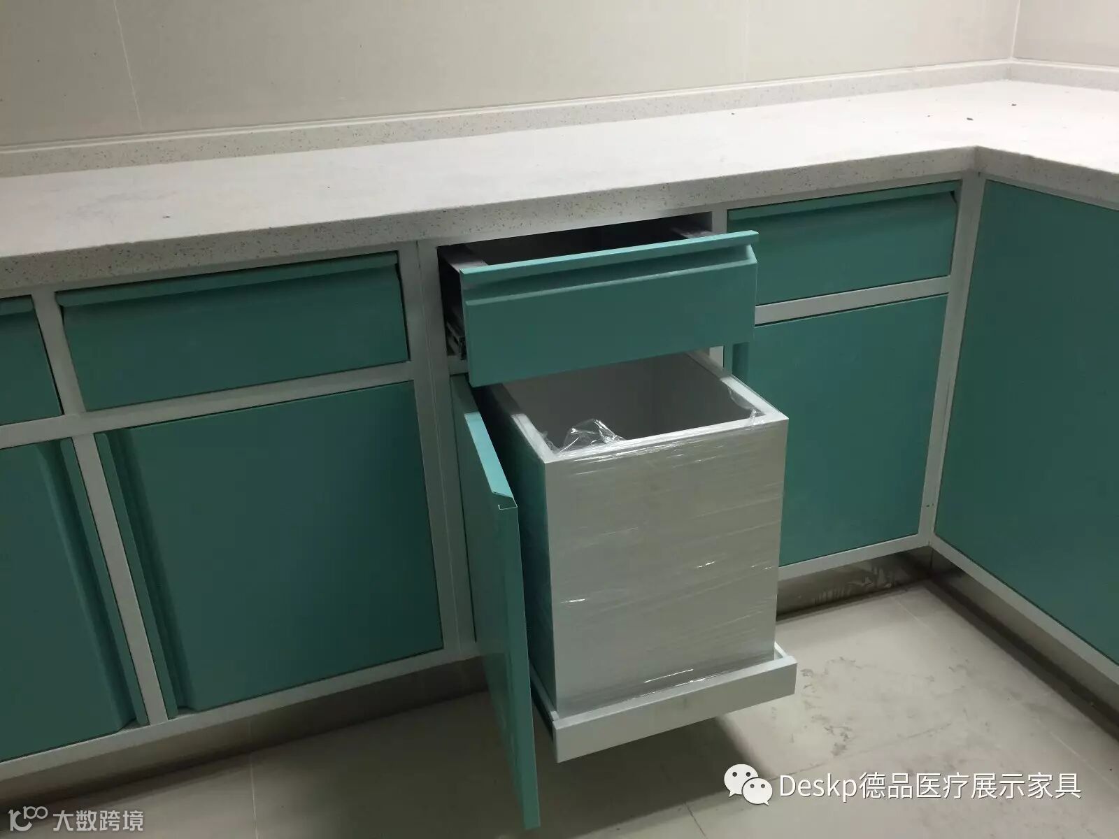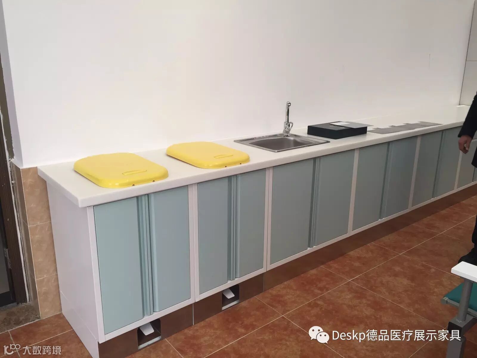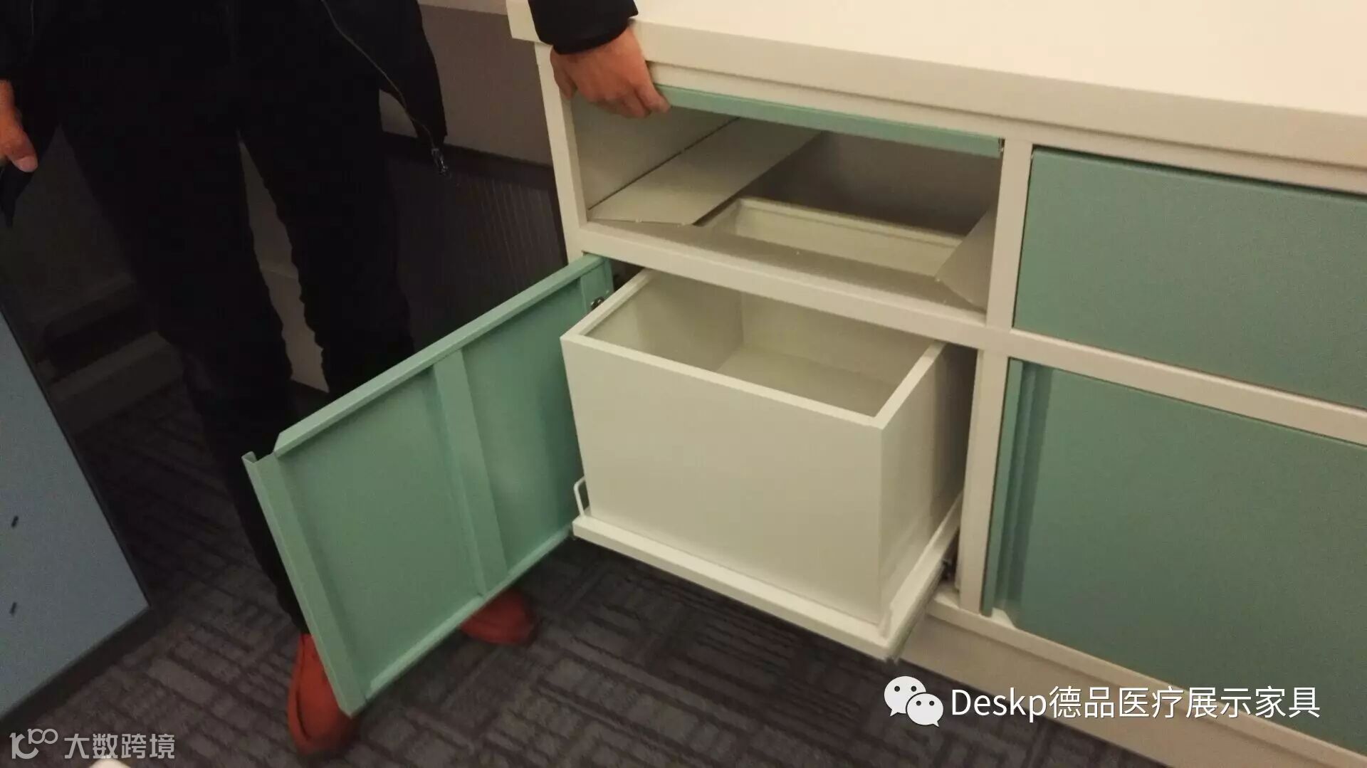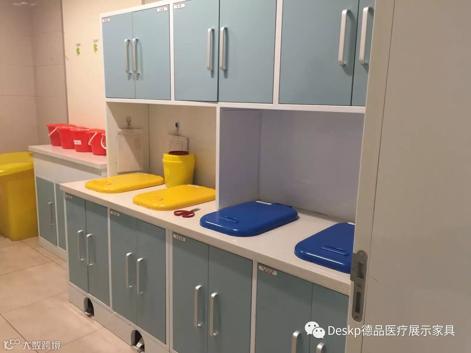 双面投放处置柜的功能:医护人员可在治疗室直接把垃圾投入双面处置柜,然后垃圾从处置室转移。