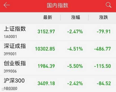 昨日两市股指大幅下跌,上证指数失守3200点,创业板指更是跌破2000点大关。截止收盘,上证指数跌2.47%,报3152.97点;深证成指跌4.51%,报10302.85点;而创业板指跌5.50%,报1984.39点。