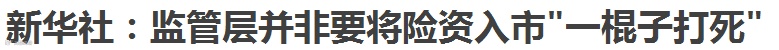 12月12日中午13时左右新华社发文称,监管层出重拳并非要将保险资金入市“一棍子打死”,而是因势利导,通过让个别“不听话”的保险机构变“乖”,巩固整个行业来之不易的向好局面。