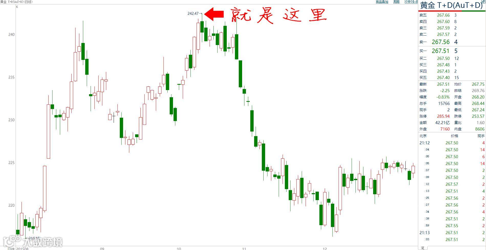 这事就要从一年前说起了。2015年10月,这哥们在做黄金TD的交易,他当时觉得黄金创出了阶段新高还能涨,于是乎就在242元的位置买入了黄金,买的也不多,50万的保证金满仓而已。