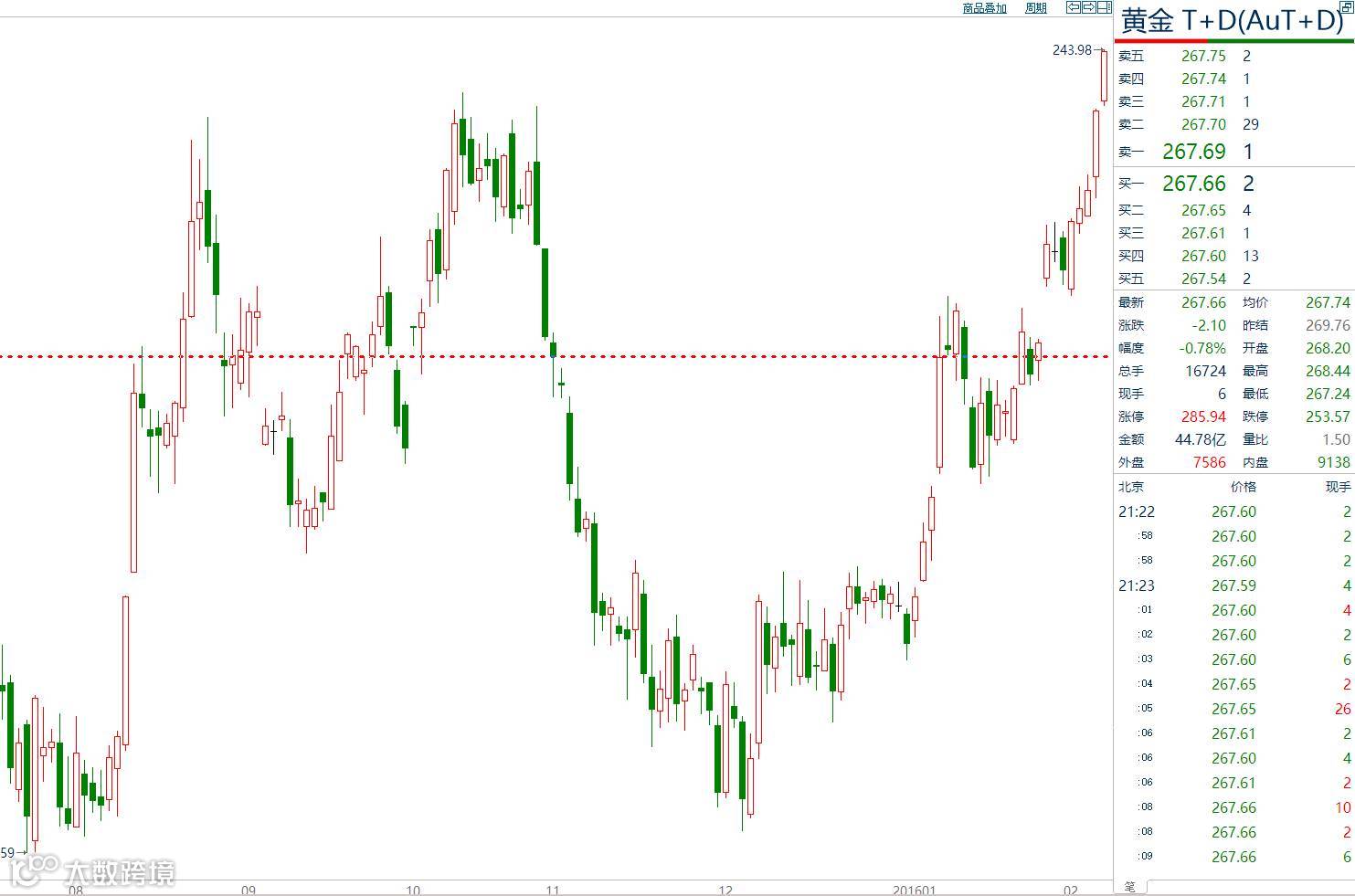 这哥们一路补充保证金一路加仓,保证金投入达到恐怖的1200多万,大家知道黄金TD是有十倍杠杆的,也就是说他持有了1.2亿的黄金。他坚持扛过了2016年元旦,终于转运了,黄金见底回升,看下图:
