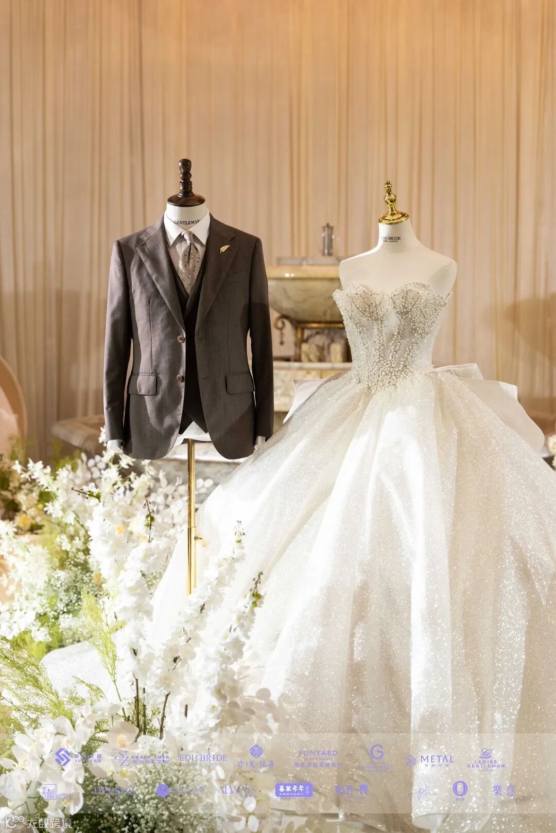 无暇的温柔白纱,永恒的歌颂,缎面与蕾丝交织的浪漫诗篇,强烈的巴洛克复古华丽,是永不过时的经典奢华。经典配色的男士西服点缀着婚纱照中的每一帧画面。