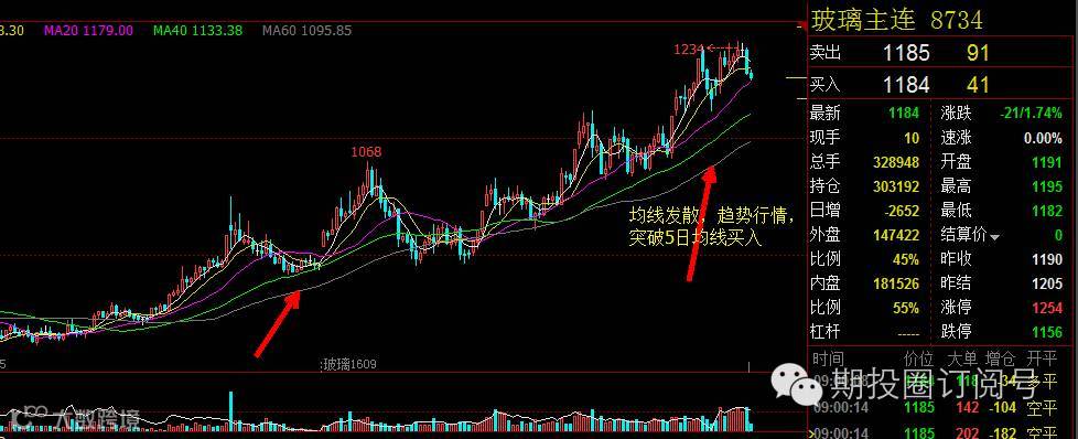均线发散,趋势行情,突破5日均线买入: