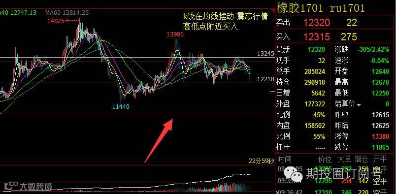 第二:就是分析行情,在杂乱无序的行情里分为趋势行情和震荡行情,趋势行情的均线发散,而震荡行情的k线在均线里上下摆动。一般趋势行情我喜欢突破后再买入,一般定5日均线为买点,因为价格在未突破前还可能延续之前走势,而震荡行情我喜欢在高低点附近买入,这样易控制风险,只要有效突破高低点即可止损。