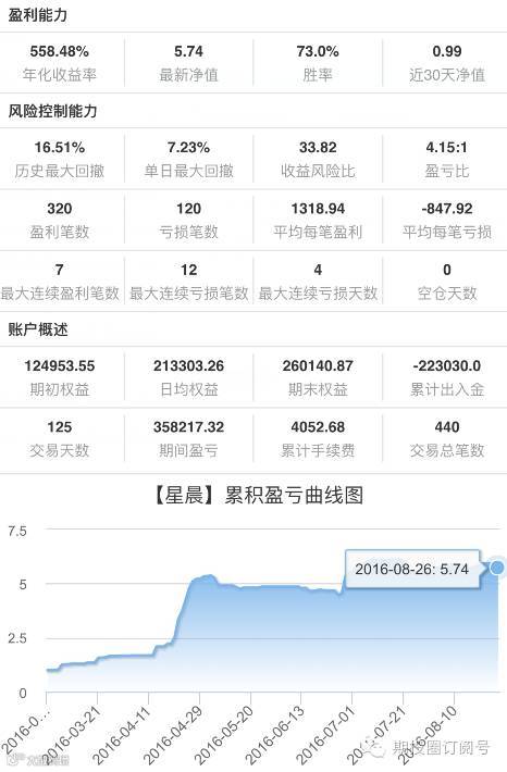 星晨导师自2016年8月9日起正式入驻期投圈开设导师教室,截止目前星晨导师实盘交易的展示账户年化收益率为558.48%,胜率73%。