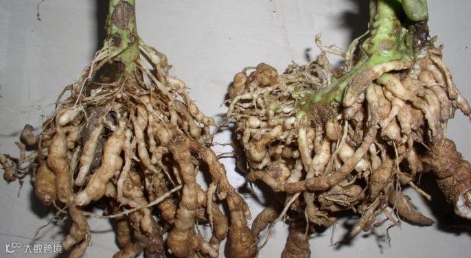 根结线虫主要侵染植株根部,以侧根和须根最易受害。 发病株在侧根和须根产生大小不一、形状不定的肥肿、畸形瘤状膨大,瘤状物初为白色,质地柔软,后期变为淡褐色,表面有龟裂。 轻病株地上部症状不明显,重病株发育不良,植株矮小,叶片黄化,结果少,发病严重时,全株枯死。