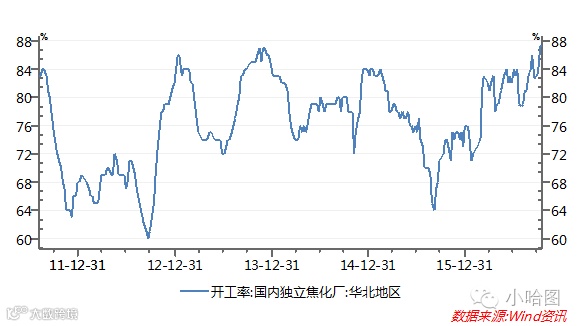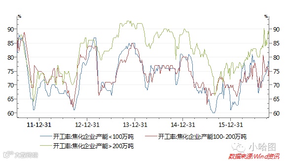 炼焦利润的压缩也可以从焦化厂的开工率得到部分解释,在丰厚利润的诱惑下,焦化厂在可开工的情况下肯定是卯足了劲生产了,华北地区焦化厂的开工率已接近88%,重回近5年的高位。再看分产能的开工率,可以发现自6月份焦化厂限产以来,三种规模的焦化厂开工率开始分化:200万吨以上的大厂开工率几乎没受影响,仍然扶摇直上至现在的90%;而200万吨以下的中小厂就被无辜的去产能了,开工率下去了较难起来。