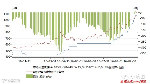 而焦期煤货价格相对现货就有点不同了,对标山西产主焦煤市场价来看,之前一直都是期货大幅升水现货,直到最近才开始接近平水,截至10月18日收盘,焦煤期货主力1701合约的收盘价1180元/吨相对山西主焦煤市场价1125元/吨升水55元/吨,离京唐港库提价1300元/吨也不远了,毕竟焦煤的矛盾相比焦炭更突出,焦煤期货这么个涨法也能理解。