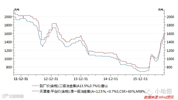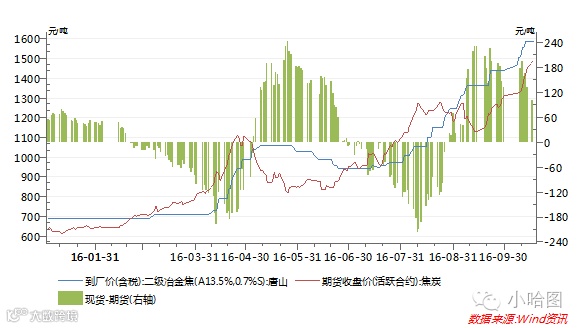 虽然焦炭期货价格轻轻松松拉出了个十连阳,但截至10月18日收盘,焦炭期货主力1701合约的收盘价1497元/吨相对唐山二级冶金焦到厂价1585元/吨仍贴水近100元/吨,期货这么拼命都还没追赶上现货,只能说现货跑得太疯癫。