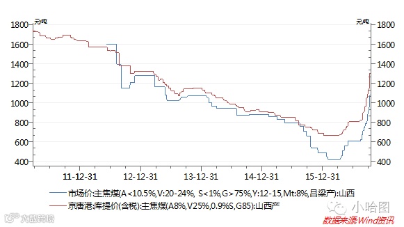 截至10月17日,山西产主焦煤车板价已提到1075元/吨,京唐港库提价甚至已经高达1300元/吨,相对8月初的价格涨幅高70%左右。
