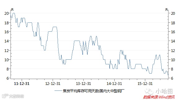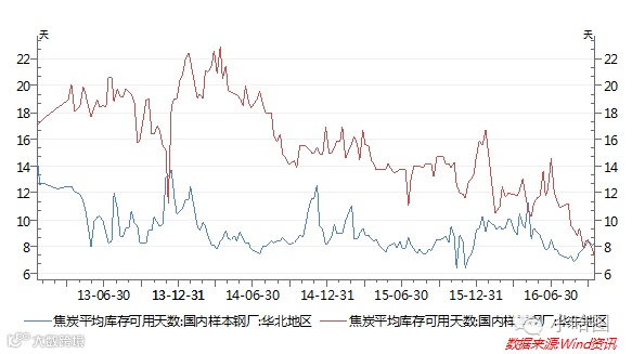 截至10月14日,国内大中型钢厂焦炭平均库存可用天数下降到6天,库存确实有点捉襟见肘,其中,华北地区样本钢厂焦炭平均库存可用天数为8.3天,华东地区为7.3天,都处于较低水平。所以对于焦炭的提价,钢厂也只能逆来顺受了。