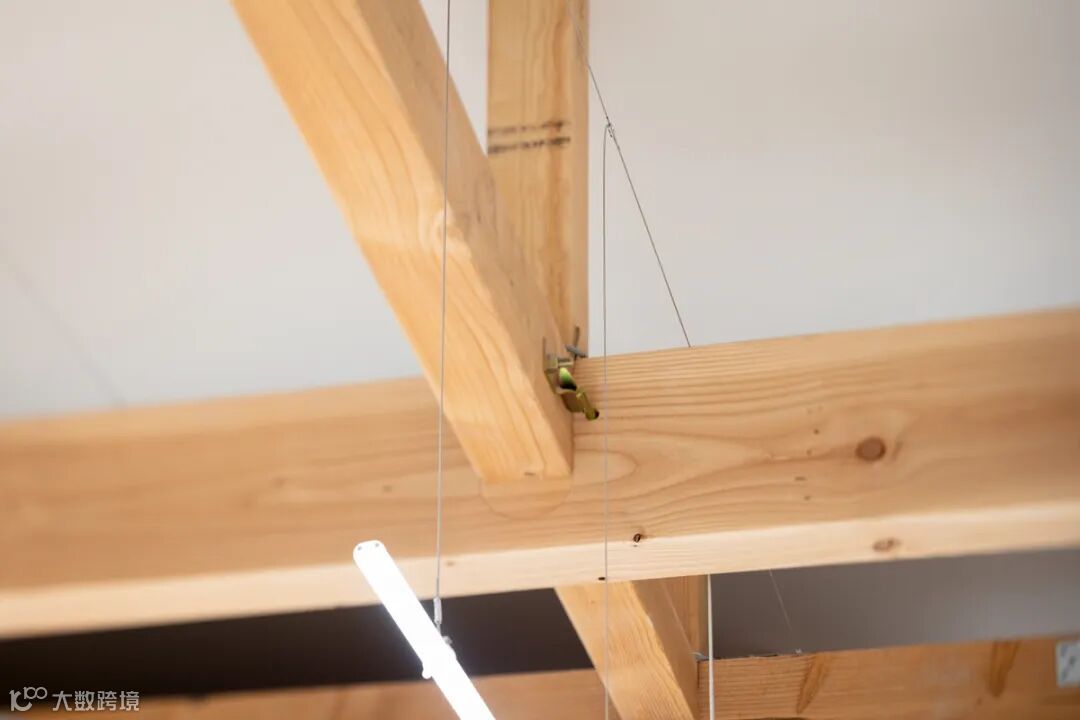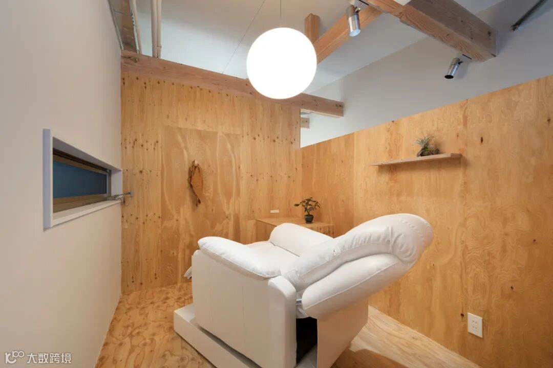 美睫室阻止了街上的人看到发廊区域,一块木板将两个功能空间前后隔开。 The eyelash space (box) prevents people on the street from seeing the hair salon area. Panels partition the cutting area front to back.
