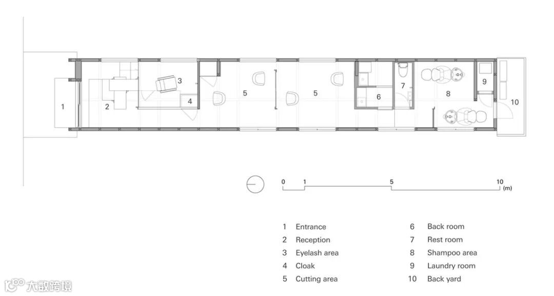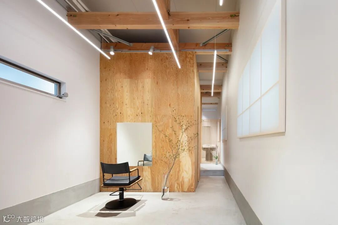“夹缝里生存”的日本理发店,59㎡玩转多种功能 LAND是一个理发和美睫沙龙,业主有一个狭长的木框架底层空间,类似于老式的日本长屋。为了利用其原本的特点,设计师创造了一条长通道。 LAND—A hair and eyelash salon. The clients had a long, narrow, wood frame 1-story building, similar to an old-style Japanese nagaya row house. To capitalize on the inherent characteristics, we created a passageway with a long line of sight.
