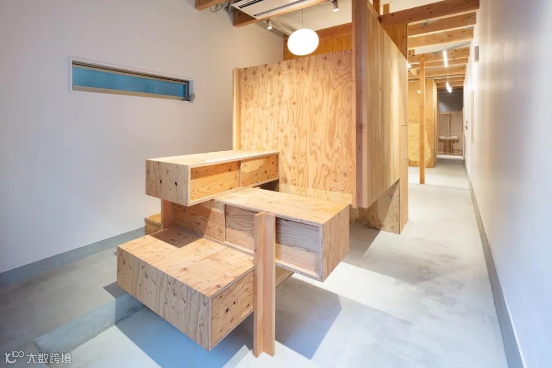接待台由堆叠的木柜子构成,它们让人联想起坦苏式的台阶柜,不仅是家具,还成为了整个空间里的特色组成部分。 The adjacent reception space is incorporated into the box’s height difference. Together they are reminiscent of a tansu step chest, falling somewhere between furniture and architectural feature.