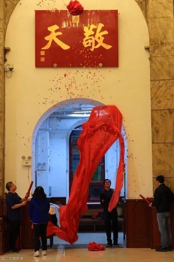 随后,雅歌读经班的诗词朗诵悠扬响起,比约合唱团以《光荣颂》的嘹亮旋律,引出四组奉献代表家庭,共同为“敬天”牌匾揭幕,红绸滑落,二字熠熠生辉。