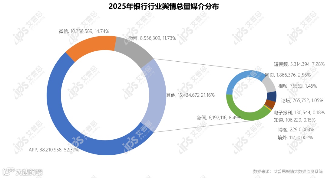 2025年,银行业舆情声量来源中,占比最高的媒介为APP,达52.37%,舆情声量为38,210,958篇次;其次为微信,舆情声量达10,756,589篇次,占比14.74%;排名第三的是微博,舆情声量达8,556,309篇次,占比11.73%;其他媒介中,短视频、新闻、网页等媒介的总占比达21.16%,舆情声量为15,434,672篇次。