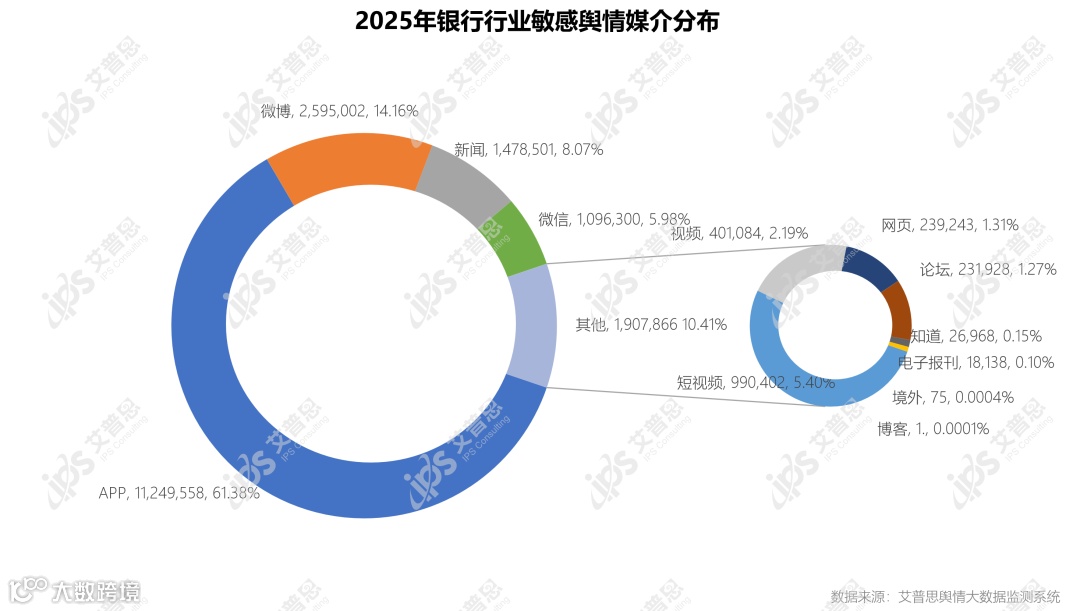 2025年,银行业敏感舆情声量来源中,占比最高的媒介为APP,达61.38%,舆情声量为11,249,558篇次;其次为微博,舆情声量达2,595,002篇次,占比14.16%;排名第三的为新闻,舆情声量为1,478,501篇次,占比8.07%;第四为微信,舆情声量为1,096,300篇次,占比5.98%;其他媒介中,短视频、网页、论坛等媒介的总占比达10.41%,舆情声量为1,907,866篇次。