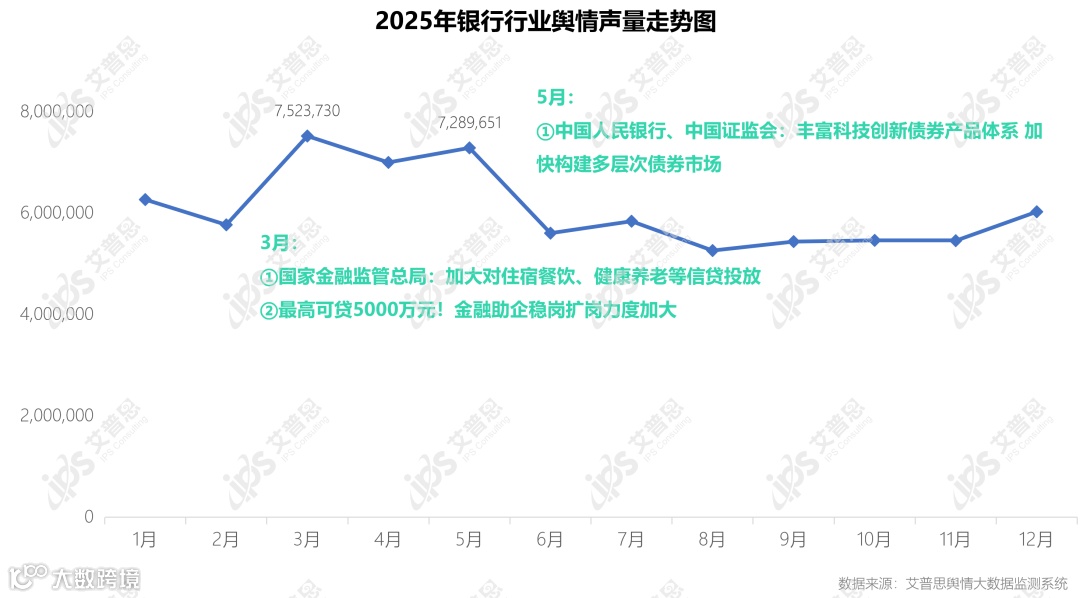 艾普思舆情大数据监测系统显示,本年度,涉及银行业的舆情声量为72,958,528篇次,较去年舆情声量同比减少19.78%(2024年舆情声量为90,949,022),月均声量达6,079,877篇次。本年度上半年声量高峰主要出现3月(声量7,523,730)和5月(声量7,289,651篇次),主要受“国家金融监管总局:加大对住宿餐饮、健康养老等信贷投放”、“最高可贷5000万元!金融助企稳岗扩岗力度加大”、“中国人民银行、中国证监会:丰富科技创新债券产品体系 加快构建多层次债券市场”等相关信息影响。