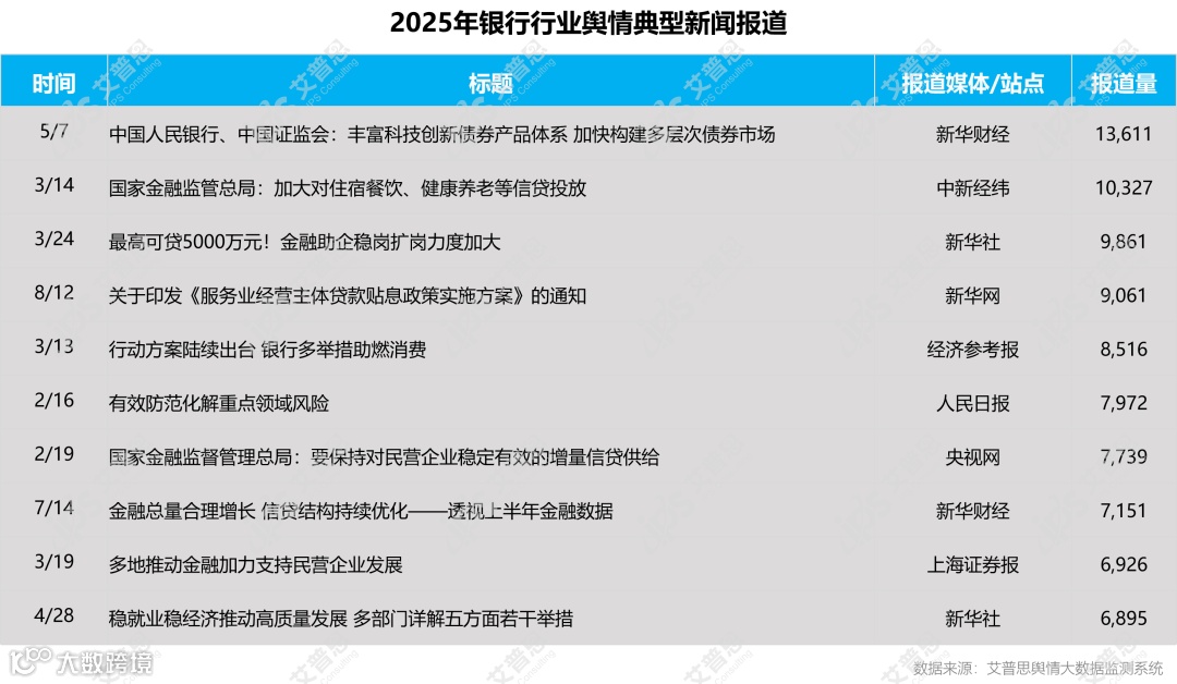 2025年,银行业舆情典型报道有《中国人民银行、中国证监会:丰富科技创新债券产品体系 加快构建多层次债券市场》《国家金融监管总局:加大对住宿餐饮、健康养老等信贷投放》《最高可贷5000万元!金融助企稳岗扩岗力度加大》《关于印发〈服务业经营主体贷款贴息政策实施方案〉的通知》《行动方案陆续出台 银行多举措助燃消费》等,报道量排名前十的信息为: