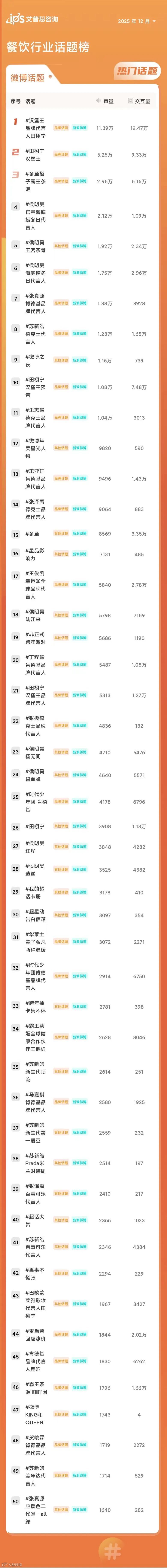 2025年12月餐饮行业排名前三的热门话题为:#汉堡王品牌代言人田栩宁(品牌话题,声量11.40万,交互量23.60万)、#美食(行业话题,声量10.43万,交互量655.58万)、#火锅(行业话题,声量5.32万,交互量200.28万)