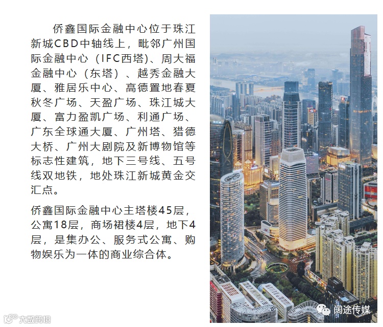 地下三号线、五号线双地铁,地处珠江新城黄金交汇点。侨鑫国际金融中心主塔楼45层,公寓18层,商场裙楼4层,地下4层,是集办公、服务式公寓、购物娱乐为一体的商业综合体。