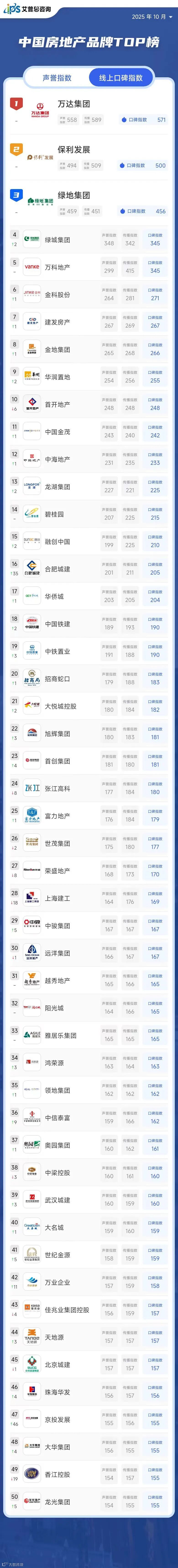 2025年10月线上口碑指数位列前三的房地产品牌为:万达集团(口碑指数571,排名与上月持平)、保利发展(口碑指数500,排名与上月持平)、绿地集团(口碑指数456,排名与上月持平)。