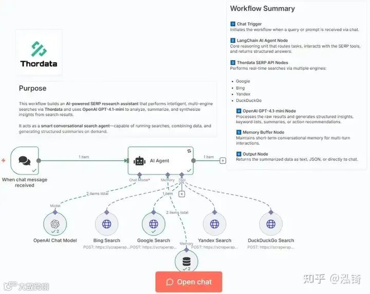 如果您希望构建一个能够智能查询多个搜索引擎并汇总结果的 AI 搜索助手,那么这个 n8n 工作流是一个完美的起点。该工作流利用 Thordata 的 SERP API 和 OpenAI GPT-4.1-mini,执行多引擎搜索、综合洞察,并维护用于动态查询的对话记忆。
