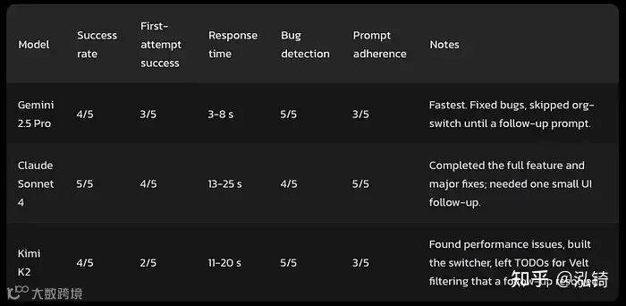 对于注重成本的开发:Kimi K2 提供最佳总价值,每项任务仅需 5.20 美元。没错,它需要后续提示,但包括您的时间在内的总成本仍然最低。此外,它还能发现其他模型遗漏的性能问题。