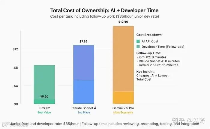 总拥有成本分析揭示了真正的赢家。虽然 Claude Sonnet 4 的 AI 成本最高,但它所需的开发时间却最少,足以编写出可用于生产的代码。 而从整体来看,Kimi K2 的性价比最高。