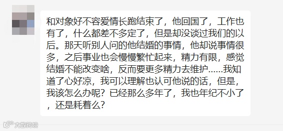 今日话题:发帖人表示和对象好不容爱情长跑结束了,他回国了,工作也有了,什么都差不多定了,但是却没谈过他们的以后。那天听别人问的他结婚的事情,他却说事情很多,之后事业也会慢慢繁忙起来,精力有限,感觉结婚不能改变啥,反而要更多精力去维护……发帖人知道了心好凉,想知道该怎么办呢?