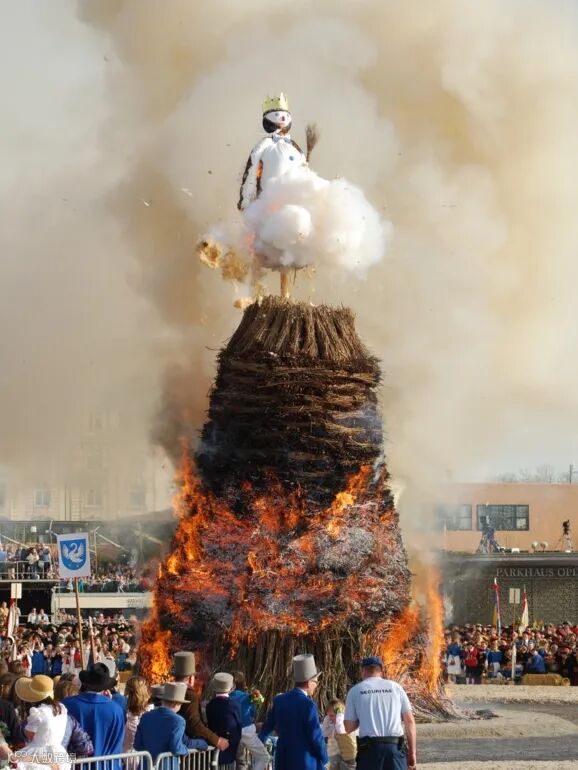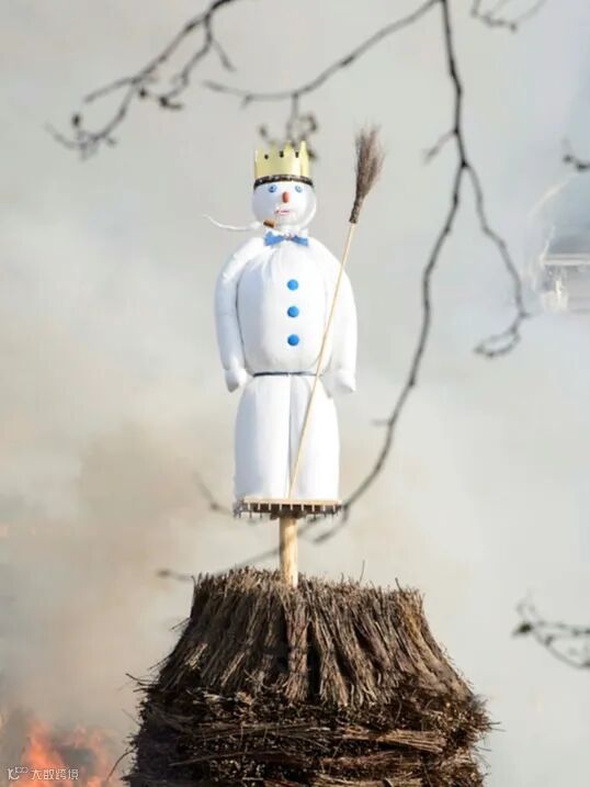 这个立在柴堆上的巨大绒棉雪人,圆圆的脑袋里塞满了炸药。它象征着刚刚过去的冗长、寒冷的冬日,即将在熊熊烈火中燃烧殆尽,迎来春日的涅槃。
