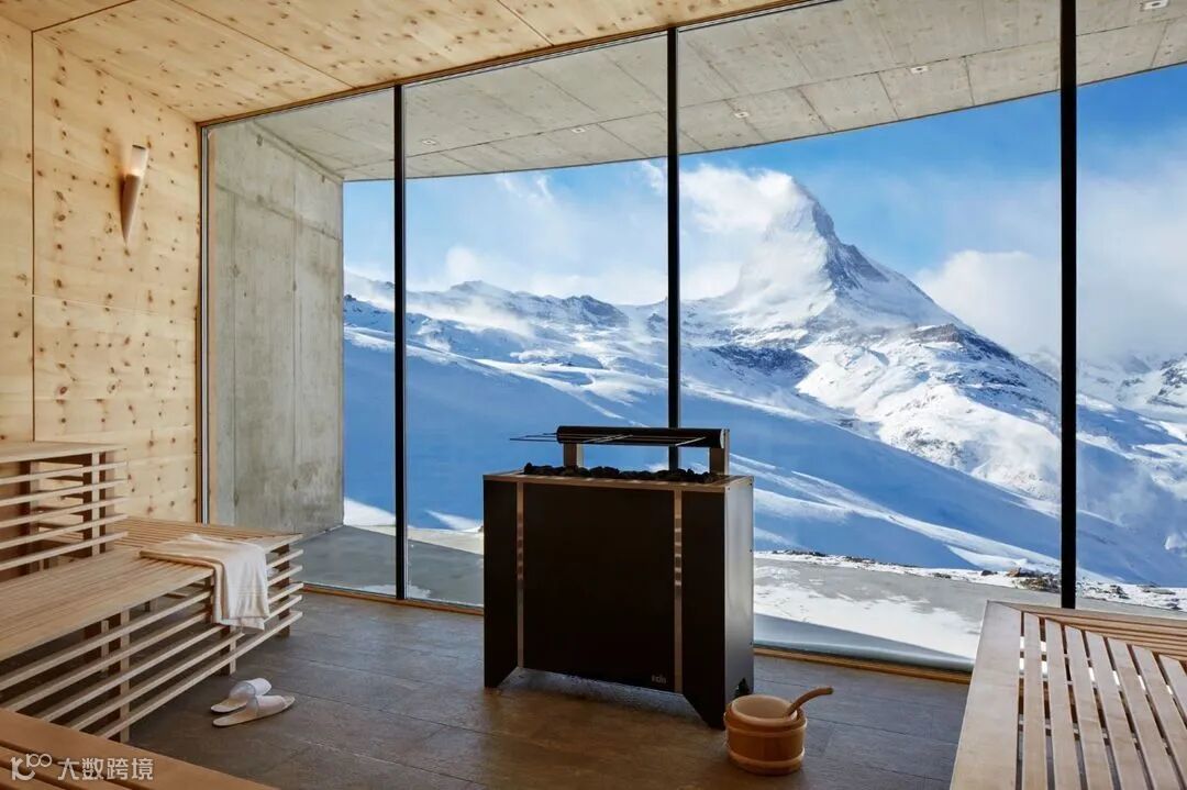 按摩浴池之外,它大片落地窗设计的桑拿烤箱也是一绝,同样以面对山王马特宏峰为要求,非常出片。