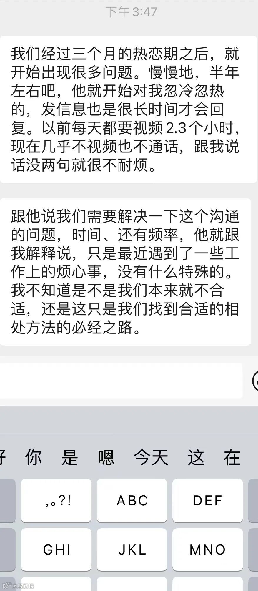 来自一位女生的投稿:她跟男友的感情本来还不错,但是过了3个月的热恋期之后,男友就变得忽冷忽热。半年后,两人关系更是直转而下,男生也不愿意沟通,只是说自己最近比较忙。