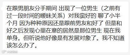 来自女生投稿:女生在跟男朋友分手期间,出现了一位有好感的男生。但因为某些原因又跟男友复合了。复合后发现还是喜欢那个有好感的男生。现在女生是单身,但是发现那个有好感的男生已经有新的发展对象了。不知道怎么办,请大家帮帮她。