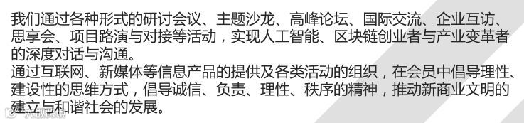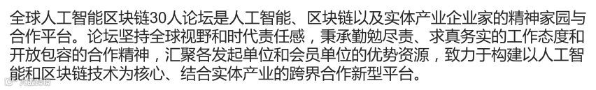 三十人论坛是全球最有影响力的产业跨界合作平台,论坛坚持全球视野和时代责任感,秉承勤勉尽责、 求真务实的工作态度和开放包容的合作精神,汇聚各发起单位和会员单位的优势资源,致力于构建以人工智能和区块链技术为核心、 结合实体企业的跨界合作新型平台。 论坛将孵化一批产业创新项目,培养一批行业精英,形成一系列的创新成果,为相关产业的生根繁荣提供不竭的源头活水和强大支撑。