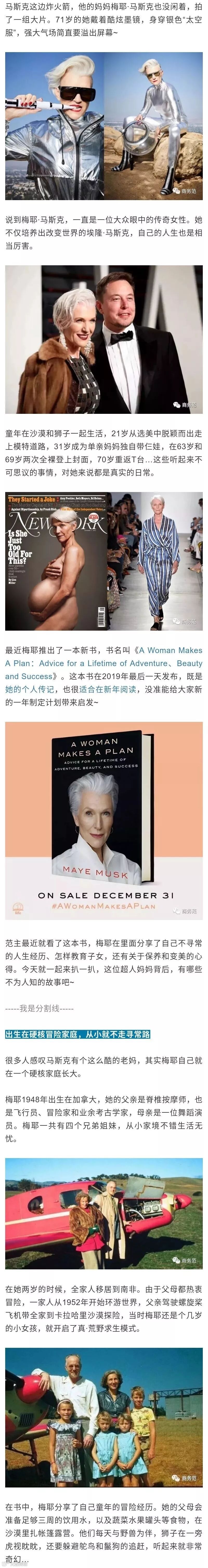以下是娜娜在众多描述马斯克妈妈的中文稿里为大家挑出的精选转载。这是我认为截至目前对梅耶的经历叙述的比较全面的一篇中文稿。以后抽时间娜娜也会自己写一篇原创。哈哈,请期待