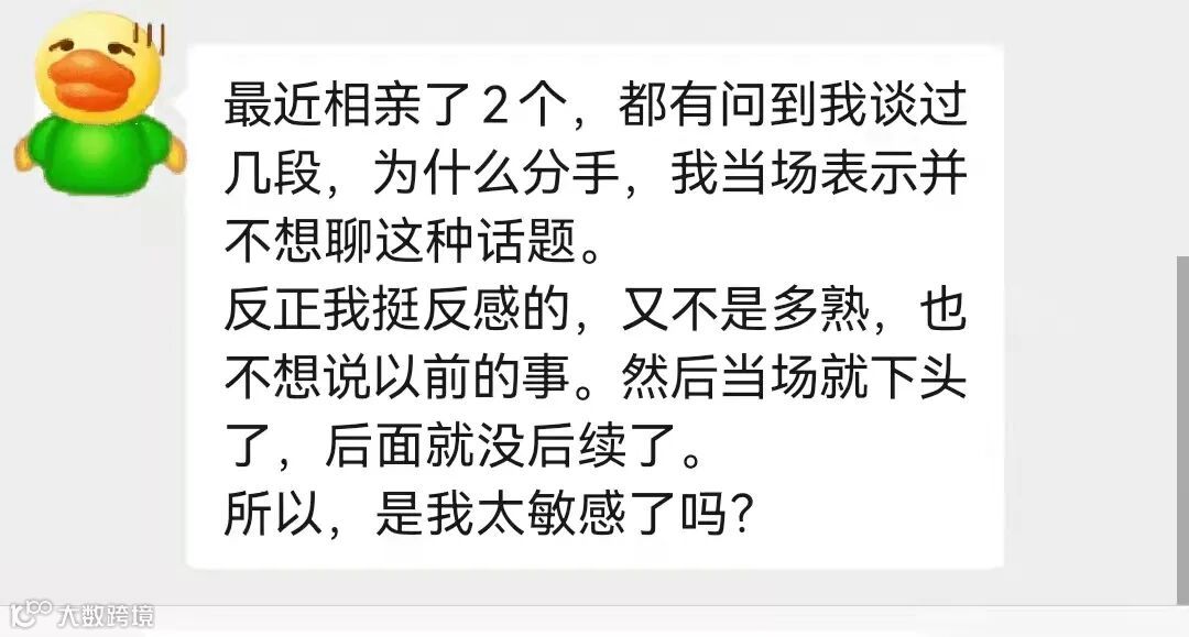 女生投稿:最近相亲了2个,都有问到我谈过几段,为什么分手,我当场表示并不想聊这种话题。反正我挺反感的,又不是多熟,也不想说以前的事。然后当场就下头了,后面就没后续了。所以,是我太敏感了吗?
