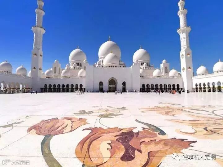参观阿联酋最大的扎伊德大清真寺。其整个建筑群都用希腊玉石包裹着,白色典雅,非常雄伟,白色基调全部用大理石装修。清真寺所展现出的传统的宗教殿堂与现代感十足的时尚气息形成双重震撼。途径全球最倾斜的建筑,倾斜18度,首都门以建筑风格奇特文明的电信大厦。酋长皇宫酒店<号称八星>酒店入内参观。
