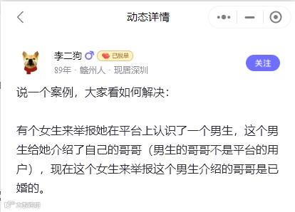 1、她声称的已婚已育的渣男不是我们平台上的人,属于她在平台上认识了一个人,这个人给她又介绍了一个平台外的人,她去跟这个平台外的人交往;