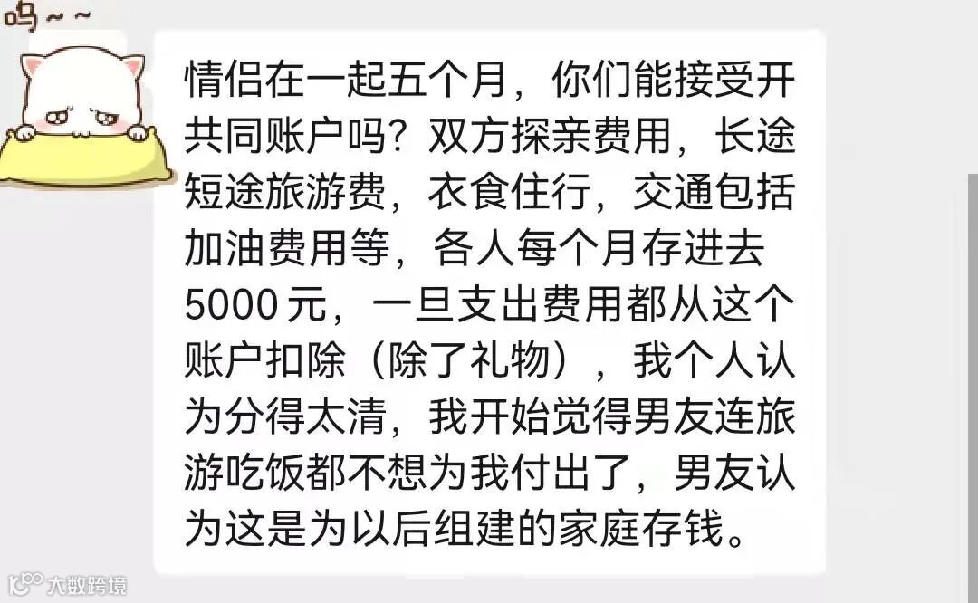 投稿简介:和男朋友在一起五个月,一起开共同账户(恋爱基金),两人存等量的钱进去,恋爱中的各种开销都从中扣除,男朋友说这样是为了以后组建家庭存钱。如果是你们,能接受吗?