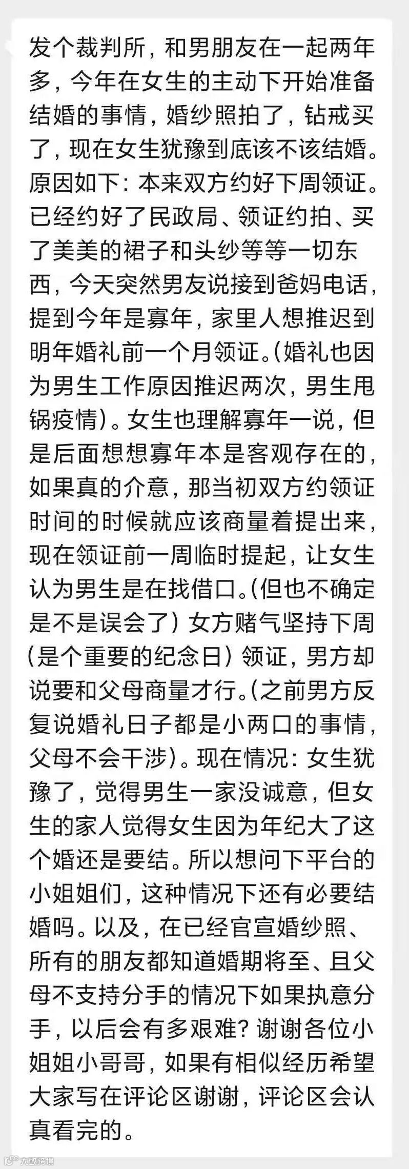 一位女生投稿说,她和男友恋爱两年多,在她的主动推送下,今年开始准备结婚事宜,约好下周领证,已经官宣婚纱照拍、买了钻戒、定婚礼在明年。但男友突然说他爸妈说今年是“寡年”,让推迟到明年婚礼前1个月领证(婚礼也因男方工作原因推迟过2次)。