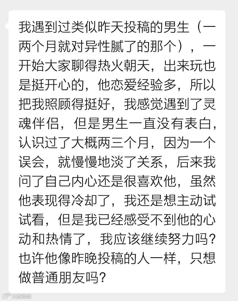 一开始聊得热火朝天,让她感觉遇到了灵魂伴侣,但男生一直没表白,认识两三个月后,因为一个误会俩人的关系慢慢淡了,她感受不到他的心动和热情了,但她内心还是喜欢他,不知道该继续主动试试吗?
