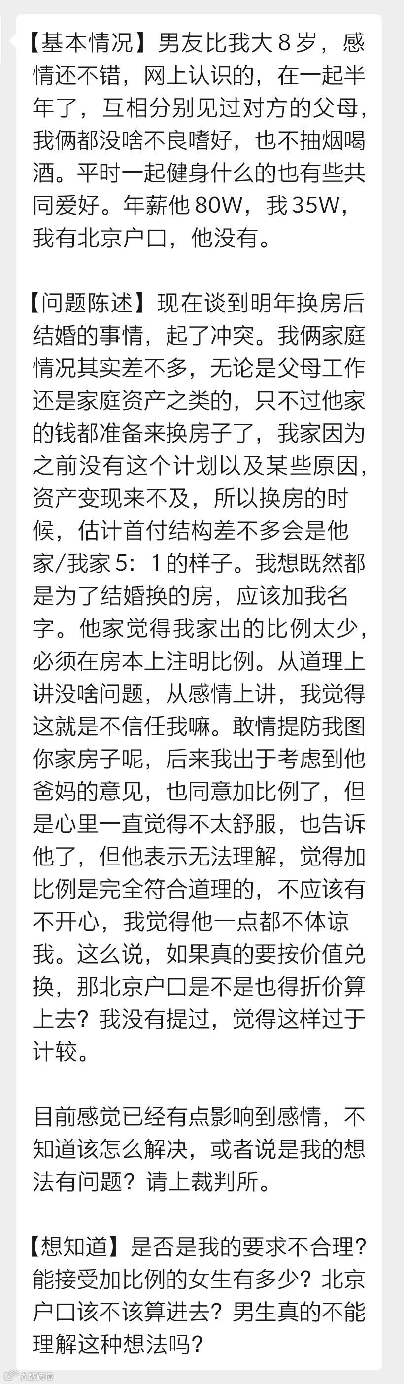 女生觉得男友一点都不体谅自己,如果要按价值兑换,她的北京户口是否也要折价计算?她没有提出来,觉得这样太过于计较。