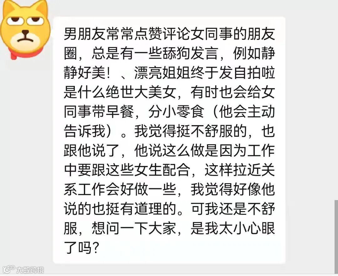 男朋友点赞评论女同事朋友圈,给她们带早餐分小零食,虽然他都会主动告诉我,并且跟我说是为了工作上她们更配合,可是我还是不舒服,是我太小心眼了吗?