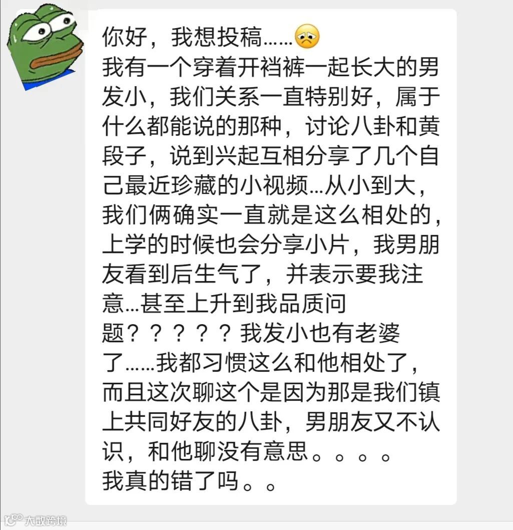 和穿开裆裤长大的男发小讨论八卦和黄段子,还分享小片,男朋友看到后生气了,但我和男发小一直是这样相处的,我真的错了吗?