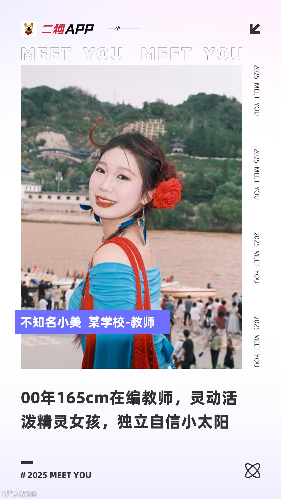 性格阳光开朗活泼,柔软、坚强、不将就!比较独立、有主见,自信女孩!本科学历,目前有一台自己名下的车。毕业时以应届毕业生身份考进体制内,目前是广州在编初中语文教师,现在在学校担任团支部书记兼大队辅导员、学科科组长,所以工作也比较忙,但周末会脱离教师角色做回一个可爱女孩,热爱生活!未来也会继续在教育事业发展。