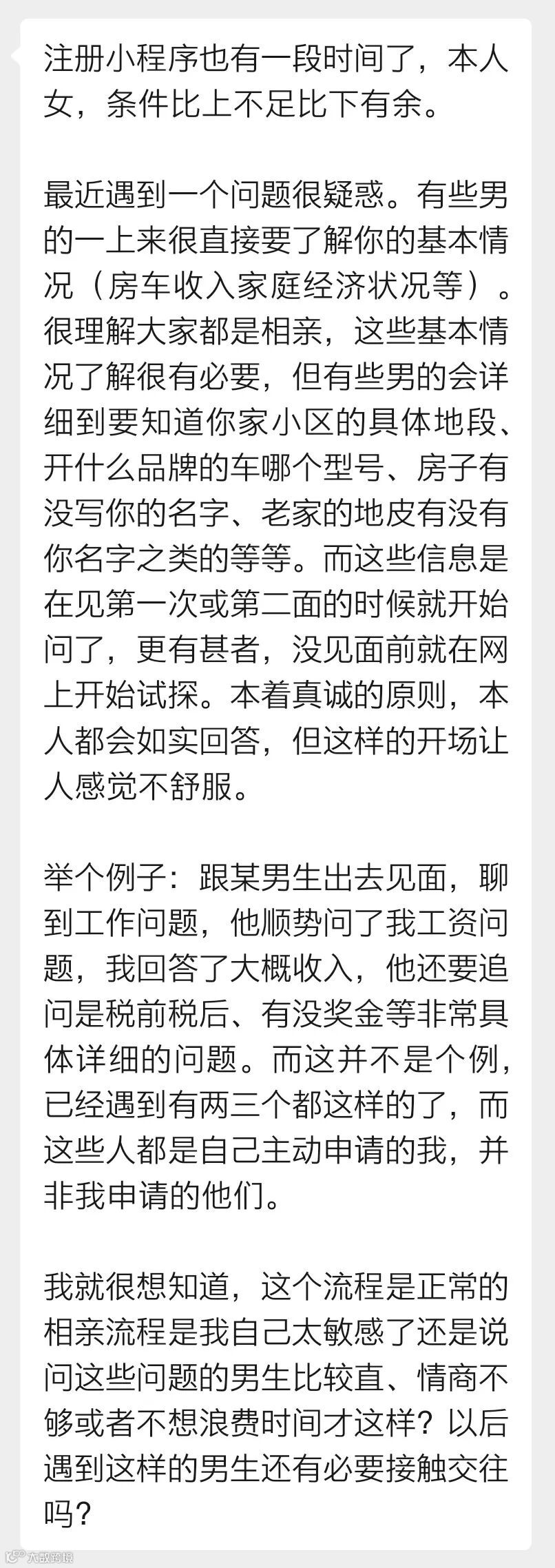 一位女生投稿说,她最近遇到一个问题很疑惑,就是有些男生一上来就很直接地想了解她的房车收入、家庭经济状况等,甚至详细到税前税后工资奖金、家里小区的具体地段、车子的品牌型号、老家地皮有没有名字等等。本着真诚交友的原则,她都会如实回答,但觉得这样的开场令人很不舒服。