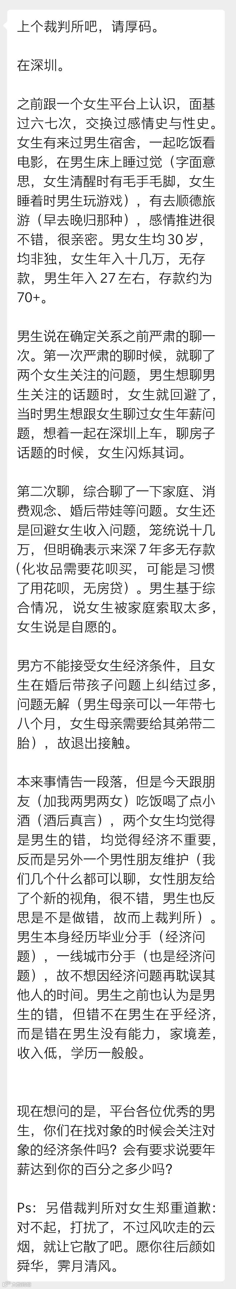 一位男生投稿说,他之前和一位女生接触进展不错,在确定关系前,他提出严肃地聊聊家庭情况、消费观念、经济收入、婚后带娃等问题,得知女生年收入大概十几万,来深圳7年多无存款(无房贷;化妆品需要用花呗买,也可能是习惯了用花呗)。
